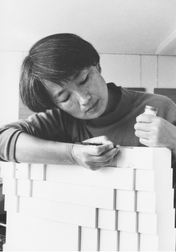 Mit einem Hintergrund in Architektur und Design kam Yoshikawa (1934, Ōmuta, Japan-2019, Zürich, Schweiz) in den frühen 1960er-Jahren nach Europa, um die vom Bauhaus inspirierte Hochschule für Gestaltung in Ulm zu besuchen, bevor sie in das Studio ihres späteren Ehemanns Josef Müller-Brockmann in Zürich einstieg. Sie arbeitete erfolgreich im Grafikdesign und hielt Vorlesungen über Rastersysteme (u.a. 1965 an der Yale University), bevor sie sich in den 1970er-Jahren mehr und mehr einer künstlerischen Praxis zuwandte und zu einer der führenden Künstlerinnen der zweiten Generation der Konkreten Kunst wurde, die auf Künstler wie Max Bill, Camille Graeser oder Verena Loewensberg folgte.