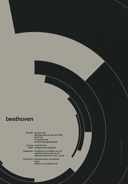 By his own admission, Müller-Brockmann spent two months designing this poster. It is one of his most important. The movement and vigor of the composer’s music are expressed in the geometric figure. Müller-Brockmann convinced the client that using lower-case print throughout would produce a more regular look for the typeface, making it more appropriate to the music.