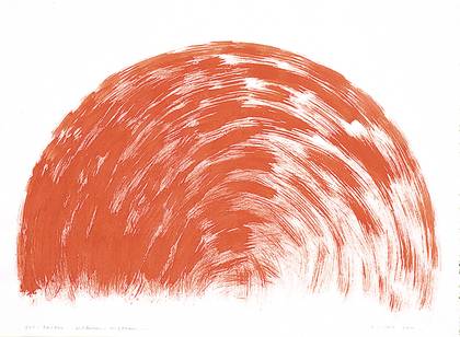 The series a roma marks a caesura and a turning point in Yoshikawa’s life and work. She had never previously diverged to such an extent from Concrete Art’s classical vocabulary. The pastel chalk drawings and gouaches, sometimes on colored handmade paper, that she made from 1997 to 1999 reflect the Mediterranean environment Yoshikawa experienced during her repeated stays in the studio of the Istituto Svizzero di Roma. From year to year, Yoshikawa’s thematic exploration of the sinking sun and pairs of crosses wedged together or drifting apart grew more balanced and lighter. Yoshikawa selected the sun as the starting point for this thematic series, deliberately breaking with Concrete Art’s non-figurative orientation. Worked in chalk, the rough-hatched or brightly clouded backgrounds display texture previously not found Yoshikawa’s paintings and drawings. In Rome, the artist worked through her grief over the death of her husband Josef Müller-Brockmann (1996). In this cyclical process of detachment, she looked back to her roots in Japan and ahead to potential new approaches for her artistic work.
